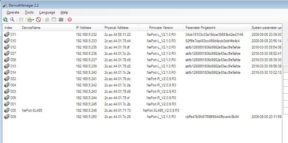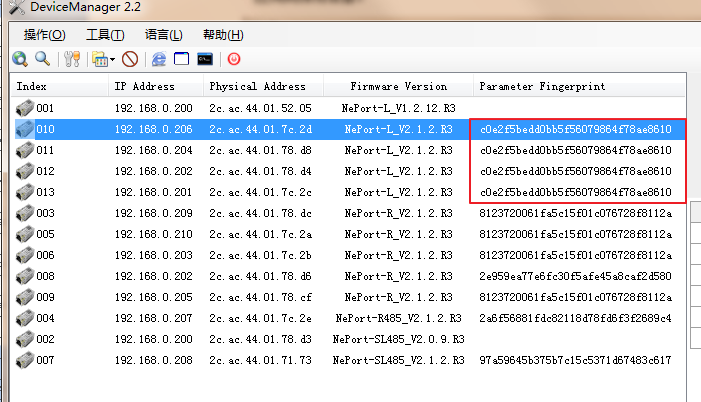 用户可通过DeviceManger2.2管理工具, 可以批量配置、调试所有模块,并根据配置后生成的配置参数识别码,OEM参数识别码等检验配置同步的完整性。适合设备制造商产线产测,项目工程安 装部署。它能将当前正在配置的模块参数按页面复制到其它同类设备。具体操作如下: