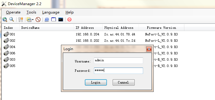 2、双击其中已搜索到的某一个设备模块,弹出模块登录窗口。然后输入用户名及密码,登录该模块进行参数配置。