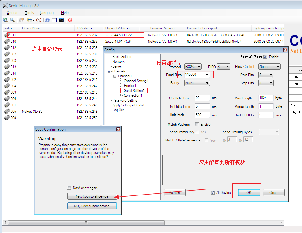 例如下图 ,将Serial Settings1菜单项上页面所有参数同步复制到其它所有同型号版本的设备。