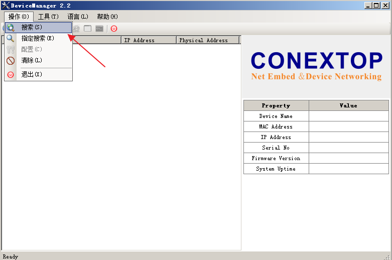 1、运行DeviceManager2.2管理工具,选择“Operate(操作)”->"Search(搜索)“,也可以点击快捷工具栏里的”Search(搜索)“图标。(说明:此操作的目的,是搜索所有在线的设备模块,管理工具的所有功能操作,仅应用到已搜索到的设备。所以,今后在执行管理工具的每项 操作前,另忘了先要搜索整个网络的设备模块。