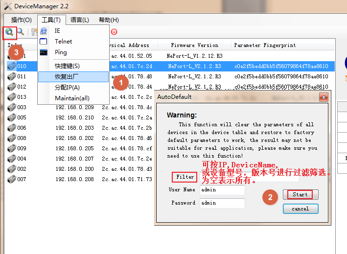 2、打开DeviceManager2.2管理工具,选择"Tools(工具)"->"Default_all(恢复出厂)“,所有产品将恢复