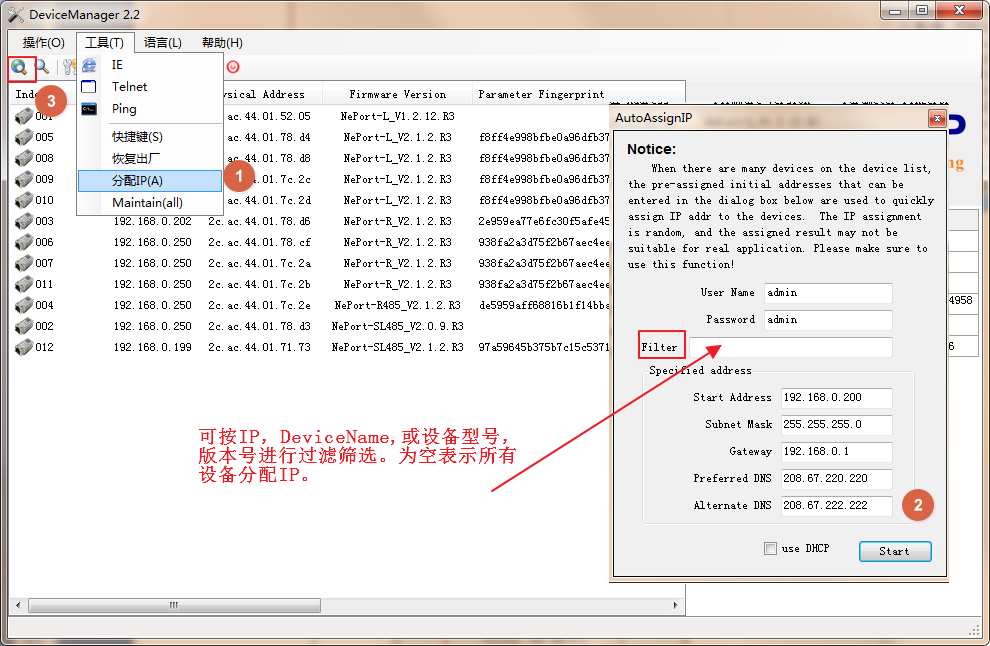 2)Filter选项匹配优先级从高到底为:IP Address->Device Name->型号->版本号。