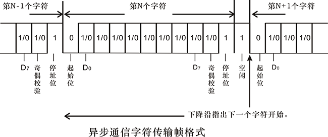 (5)空闲位:空闲位是指从一个字符的停止位结束到下一个字符的起始位开始,表示线路处于空闲状态,必须由高电平来填充。