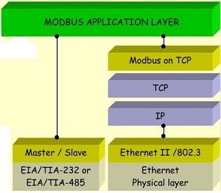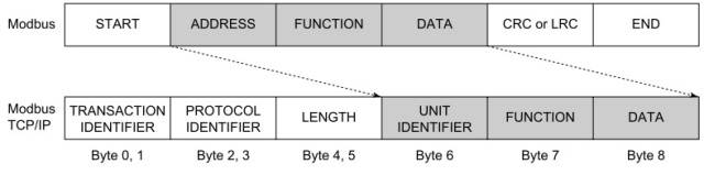 如上图所示,串行传输的物理层是RS-485或RS-232,数据链路层是Modbus的串行传输协议;Modbus TCP的1、2、3、4层实现和日常所见的以太网、因特网一样。Modbus默认采用的TCP端口号是502。