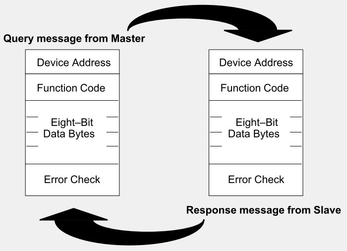 我们以串行通讯的Modbus为例(注意:Modbus TCP的报文表头和校验码与Modbus RTU是不一样的。),主站发送信息:09 03 00 04 00 03 XX,意思是主站告诉从站09,我要读取的地址偏移为4、5、6的Holding Register的数值。 其中"03"是读Holding Register的功能码,"00 04 00 01"是数据区,"00 04"是寄存器的地址,"00 03"说明要连续读三个寄存器的值。"XX"代表最后的校验位,校验方法是LRC或CRC。从站收到主站发送来的信息后,就从对应的寄存器找到数值,回复:09 03 06 02 2B 00 01 00 64 XX,意思是:从站回答,该地址偏移为4的寄存器值为02 2B,地址偏移为5的寄存器值为00 01,地址偏移为6的寄存器值为00 64。其中"09 03"是复制了主站发来的地址和功能码,"06"代表接下来的数据共有6个字节。如果从站收到了一个错误的请求,例如发现要读的寄存器地址是错误的,则回复:09 83 02 XX其中"83"是把功能码"03"的最高位置1,告诉主站发生了异常, "02"是异常码,说明发生了无效地址的异常。